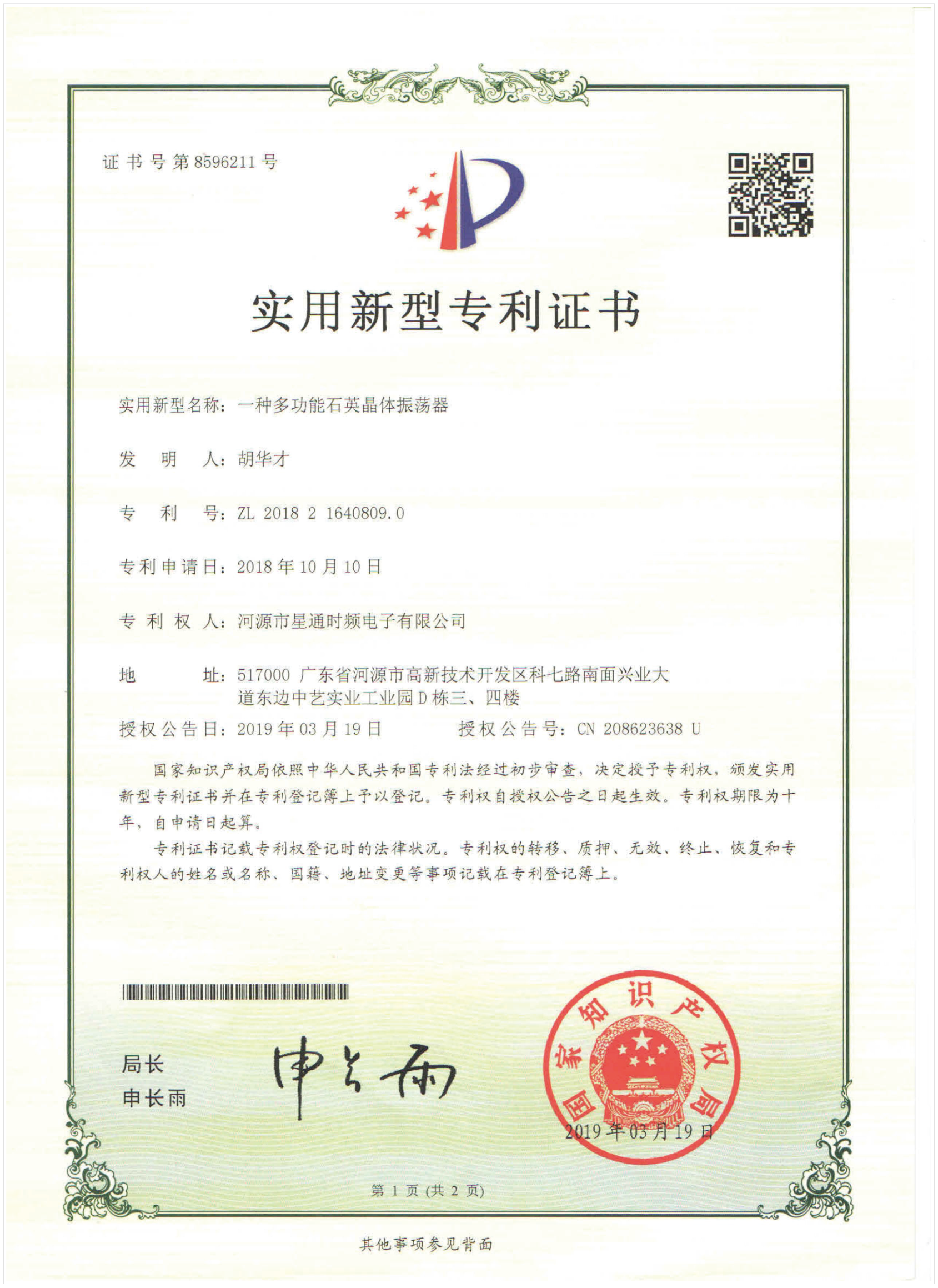 一種多功能石英晶體振蕩器實(shí)用新型專利證書(shū)